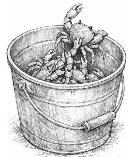 If you place several crabs in a bucket and one of them tries to climb out, the rest will pull it back down. None of them escape because they constantly block one another. If there were only one crab, it could easily get out of the bucket and thrive. However, when there are many crabs, something strange happens. Every time a crab tries to climb toward freedom and elevation, the other crabs grab its legs and pull it back down. In the end, no one escapes, and they all die in the same bucket.